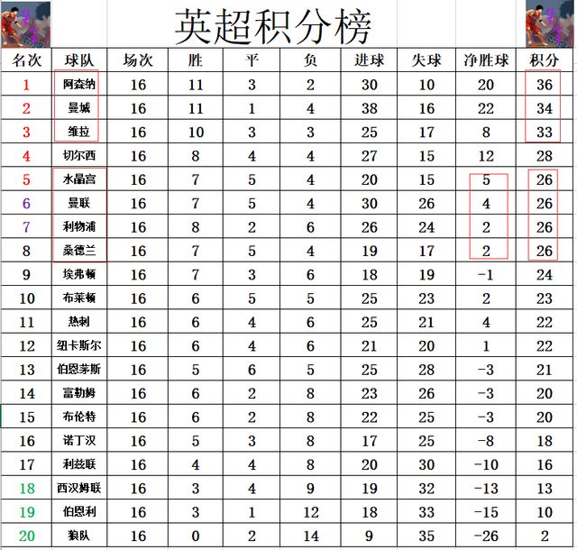 積分榜方面,第一階隊的三強咬的很緊,阿森納還是2分優(yōu)勢力壓曼城領(lǐng)跑,阿斯頓維拉差阿森納3分排在第3。爭5就更激烈,曼聯(lián)今天慘遭絕平,無力追上切爾西沖進前5,現(xiàn)在爭5的四支球隊都是26分,曼聯(lián)凈勝球優(yōu)劣勢,超過利物浦,排在水晶宮之后位列第6,利物浦被擠到第7。